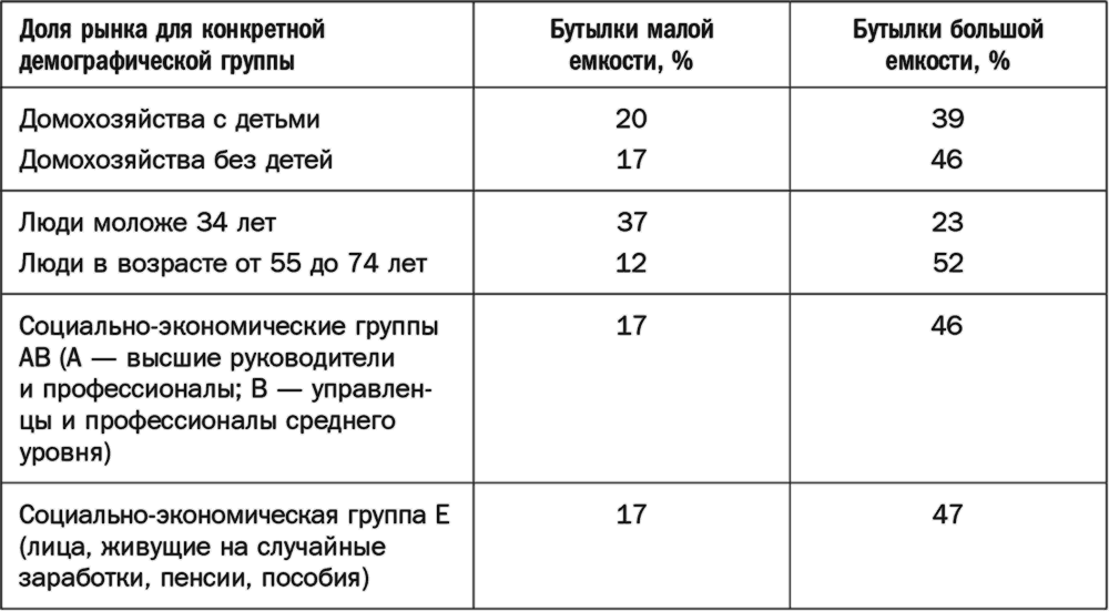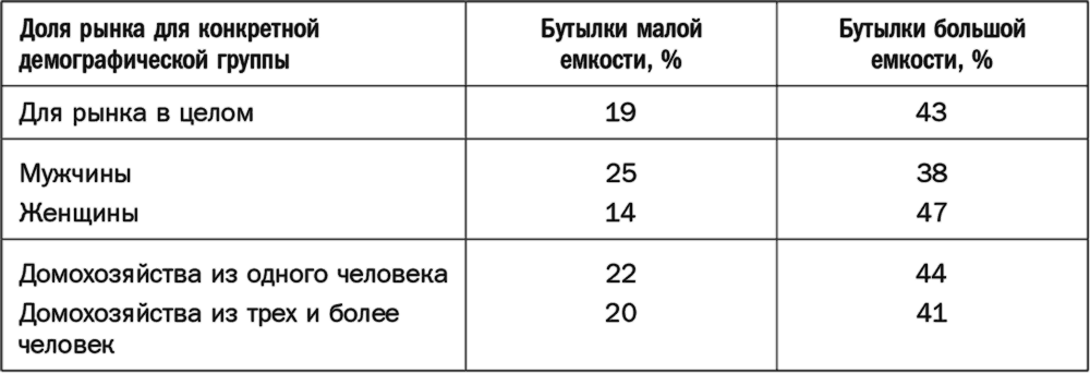Теперь давайте изучим размер упаковок (табл. 5.10). У напитков в больших банках/бутылках доля рынка выше, чем у напитков в малых емкостях. И эта особенность распространяется на все демографические группы, за исключением пожилых людей, среди которых бутылки маленького объема пользуются чуть меньшим спросом.