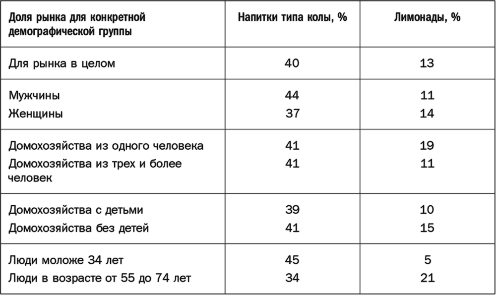 Таблица 5.11. Демографические профили напитков типа колы и лимонадов