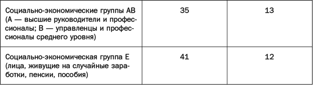 А теперь давайте сравним колу и лимонад (табл. 5.11). Как видим, лимонадные бренды больше преуспевают среди пожилых покупателей. Но поскольку люди в возрасте 55–74 лет составляют малую часть рынка безалкогольных напитков в целом, этот уклон в сторону старшей возрастной группы не дает потребительской базе лимонадов практически никакого отличия от потребительской базы напитков типа колы.