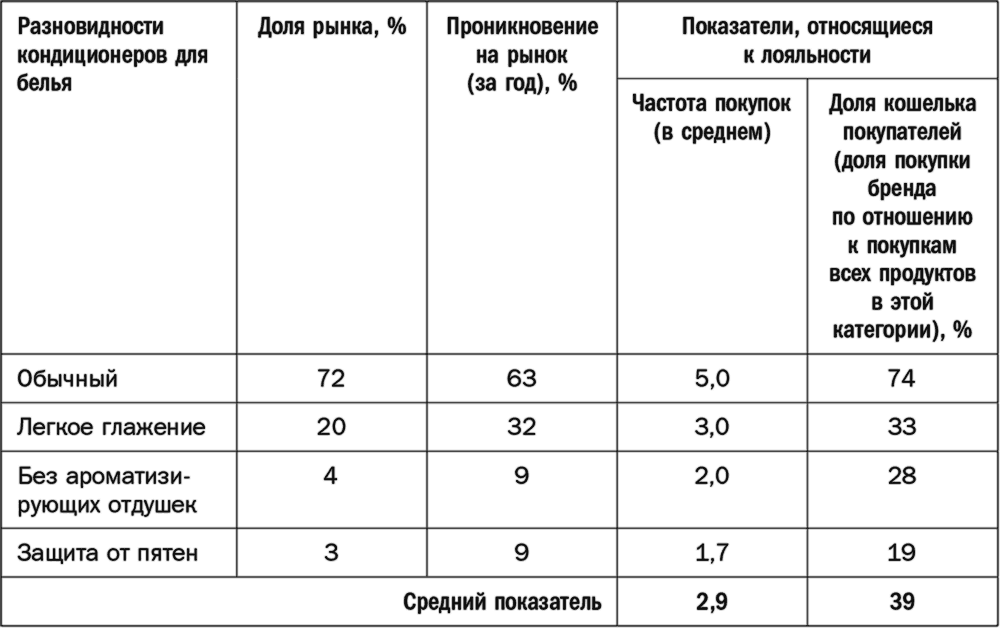 Считается, что разные варианты продукта разрабатываются специально под запросы определенных типов покупателей. Например, низкоаллергенные кондиционеры для белья должны продаваться людям, страдающим аллергией. Будь оно так, при изучении подобных вариантов мы обнаружили бы закономерности «нишевого типа»: эту разновидность продукта приобретали бы малочисленные группы очень лояльных покупателей. Но в целом ничего подобного не происходит. Если взять совсем уж специфический образец низкоаллергенного кондиционера (без запаха и цвета), то это товар далеко не ходовой и приобретают его лишь немногие и очень нечасто (закон двойной ответственности, см. главу 2). Показатели лояльности у такого продукта едва ли выше, чем должны быть в соответствии с законом двойной ответственности (табл. 5.12).